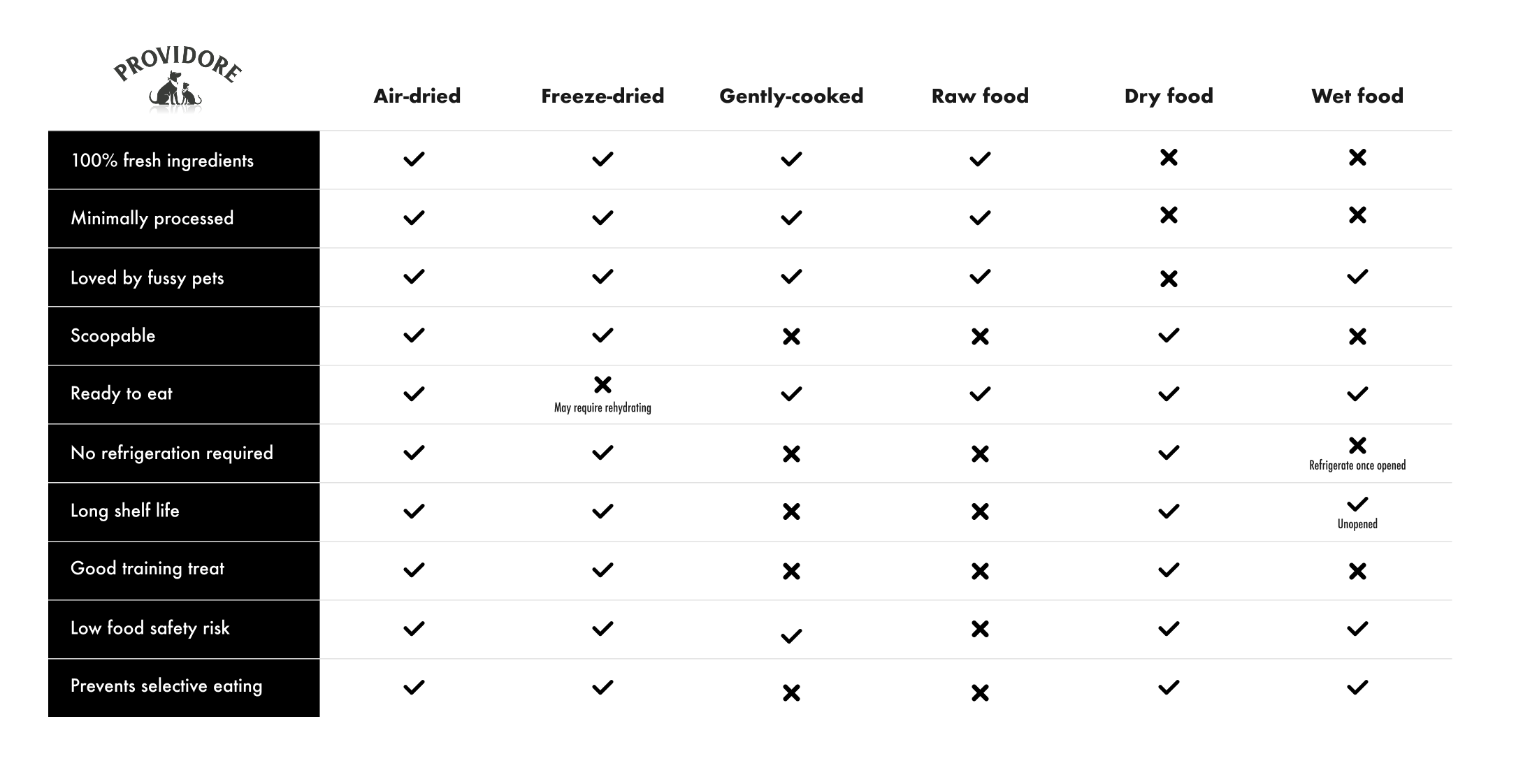 Air-dried cat foods like Providore are highly palatable, easy to serve and store, and minimally processed. A cat-loving option on its own or as a topper to their normal diet.